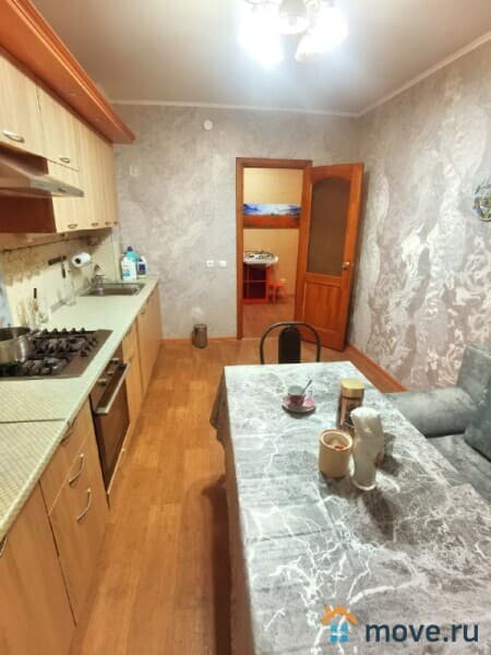 Кухня просторная, оснащена необходимой бытовой техникой: холодильником, плитой, микроволновой печью и посудомоечной машиной. Из мебели — вместительные шкафы и обеденный стол. В гостиной установлен телевизор и удобный диван.