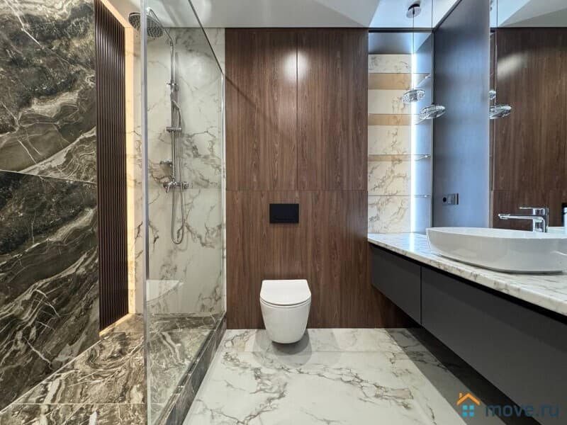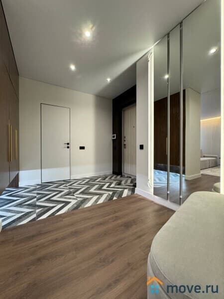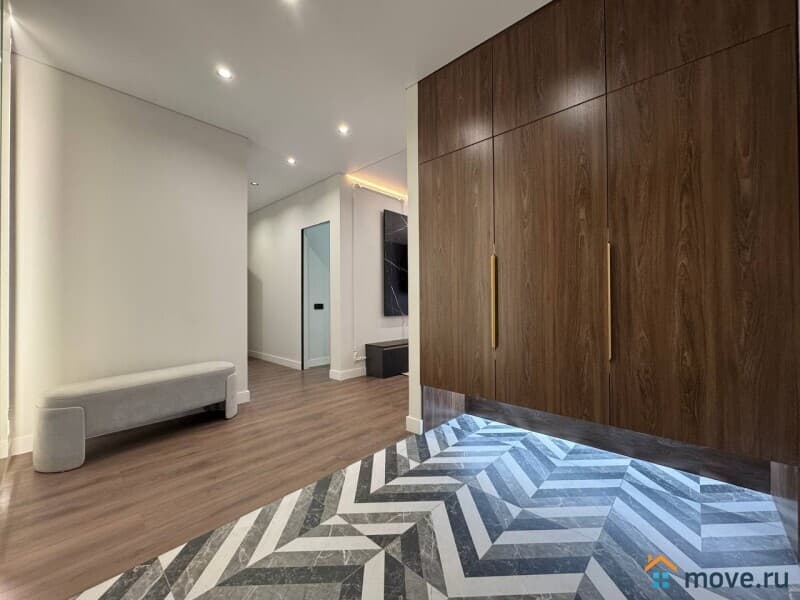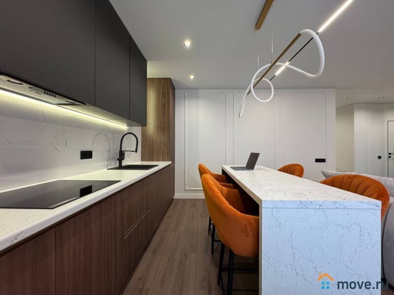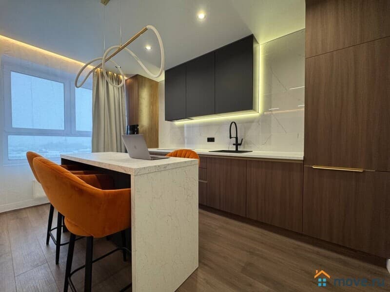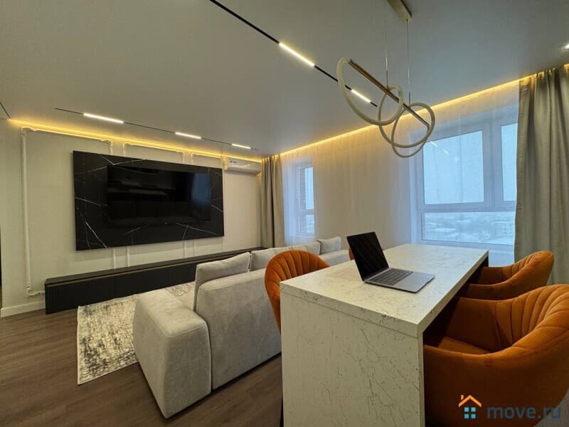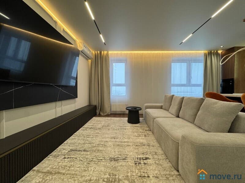 Интерьер квартиры выполнен с использованием современных дизайнерских решений. В просторной кухне площадью 13 кв. м есть вся необходимая мебель и техника, включая холодильник и посудомоечную машину. В комнатах установлены кондиционер и телевизор. Ванная комната оснащена как ванной, так и душевой кабиной. Окна квартиры выходят на улицу и во двор, что обеспечивает комфортное освещение в течение всего дня.